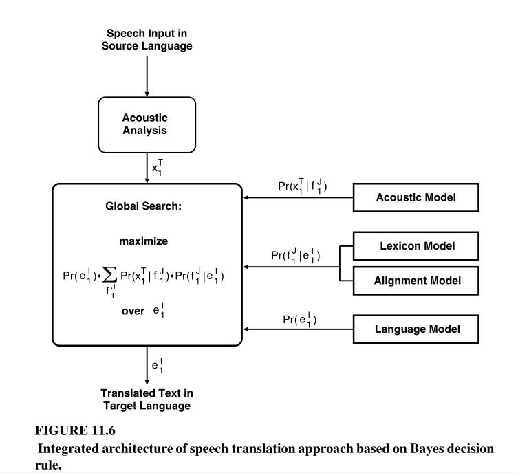 这张图描述的是语音翻译的数学原理,从语音X到源语言F再到目标语言E的概率计算,找到最高概率的目标语言文字序列。